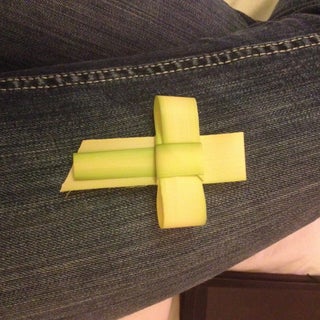 Now the long piece of paper that is left over should be at the center of the cross. This makes the left. Take a palm frond about 12 inch wide and 13 inches and hold upright 2.